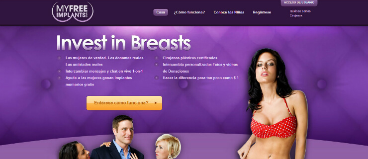 Quer colocar implantes de silicone? No My Free Implants as mulheres que desejam colocar implantes de silicone nos seios podem fazer o seu registo e pedir doações de desconhecidos. Sim, de desconhecidos! Após a cirurgia, as mulheres publicam fotografias, nuas, do resultado final mas, segundo os programadores do site, não é aceite conteúdo pornográfico. Apenas científico, se assim o podemos chamar.